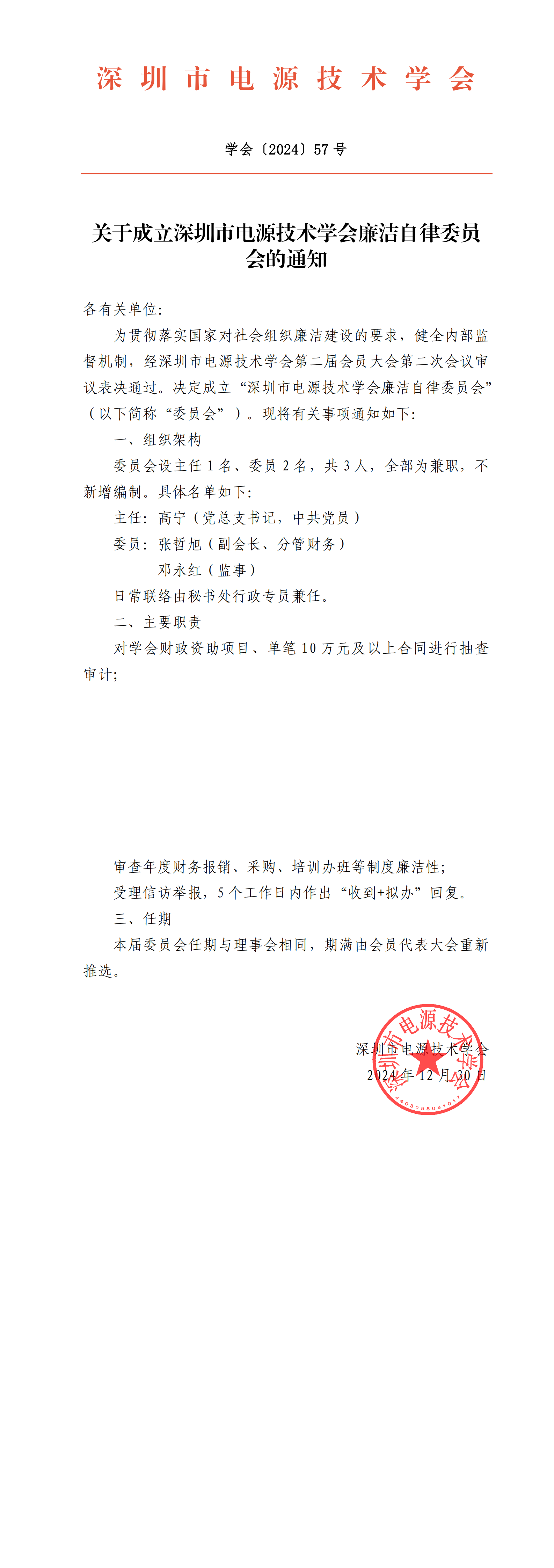 关于成立深圳市电源技术学会廉洁自律委员会的通知